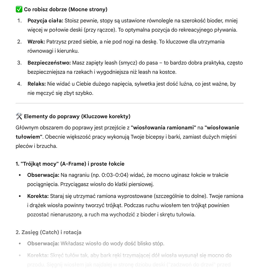 Następnie prostym poleceniem „Przeanalizuj moją technikę wiosłowania na desce SUP” otrzymałem całą listę porad, ze wskazaniem co robię dobrze, a co wymaga poprawy. Oto fragment odpowiedzi: